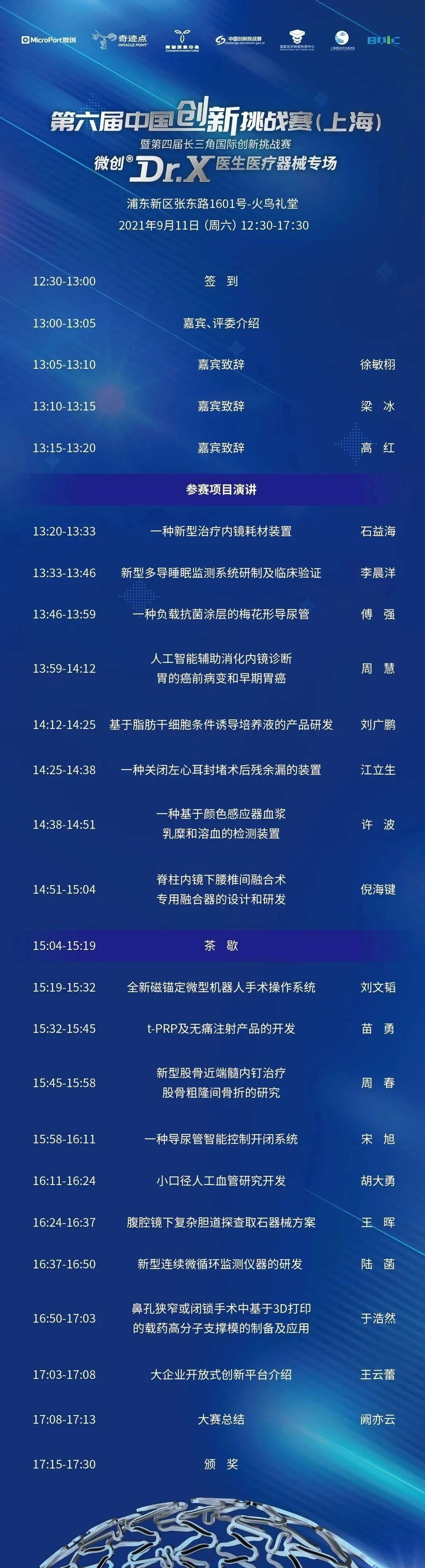 此次決賽特邀請到上海市衛(wèi)生健康委員會科技教育處處長高紅、上海市科學技術委員會創(chuàng)新服務處副處長梁冰、浦東新區(qū)科技和經(jīng)濟委員會副主任徐敏栩、張江高新技術創(chuàng)業(yè)服務中心主任雷亞洲、上海醫(yī)藥衛(wèi)生技術轉移服務平臺負責人牛玉宏等領導參加,將以線下路演的形式開展,于2021年9月11日微創(chuàng)®火鳥禮堂舉行,歡迎大家前來觀看!